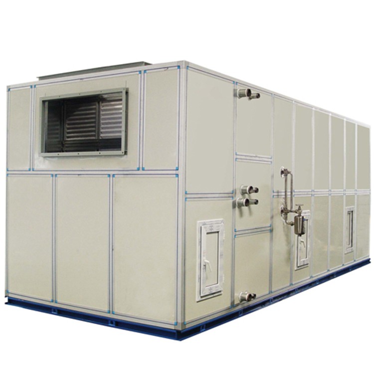 组合式空调机组是由各种空气处理功能段组装而成的一种空气处理设备。适用于阻力大于100Pa的空调系统。 机组空气处理功能段有空气混合、均流、过滤、冷却、一次和二次加热、去湿、加湿、送风机、回风机、喷水、消声、热回收等单元体。